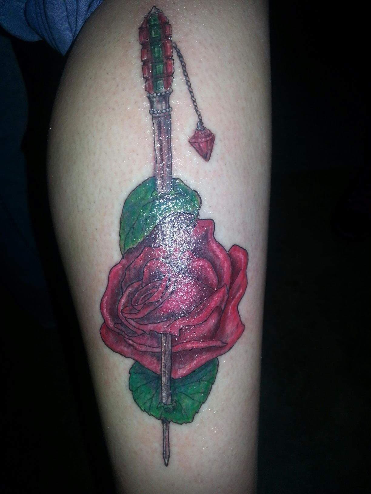 When I had finished the book, T came down to Heart’s tattoo studio and got a tattoo of Sob’s hair pin stabbed through a red rose. She got it on her calf. She was the first to tattoo an image from my world onto her body.