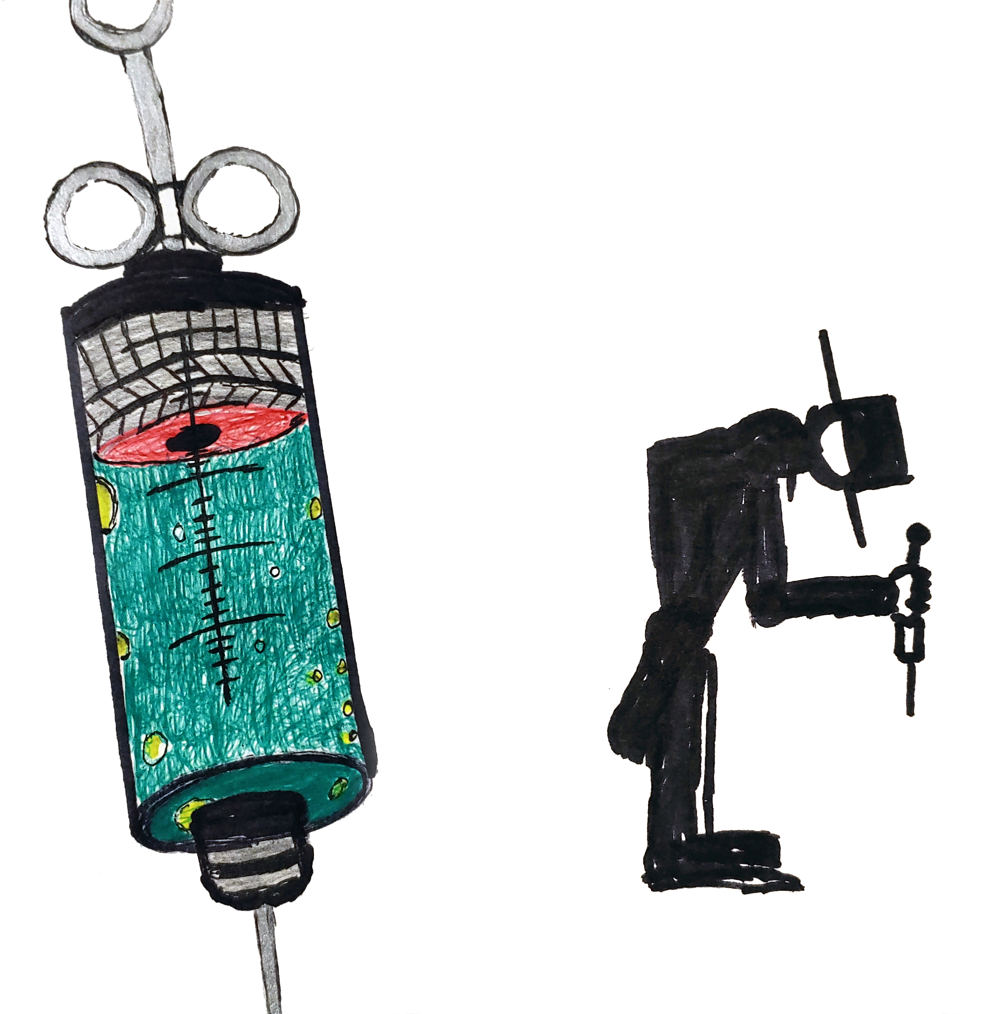 So I’m not an artist. I know very few basics of art that I used on this picture of the man. Did we decide to call him a man? You start with shapes. I drew the head first. A shape for the neck, small like a bean. A longer oval for the back. Started putting him together with basic shapes. As soon as I had those shapes laid out, I was gripped with a terrible fear, and I started slashing. I’m proud of the collar and I’m proud of the way the back of the coat rises off the back of the legs as he leans forward. The hat’s perfect, but it bothers me that the face and the head is white. And that’s not how he grips the syringe. He doesn’t grab it like a weapon. He proffers it with flair, holds it up, flips the side of the syringe to clear it of bubbles. Then he turns, and with flair, like some sadistic doctor giving a shot to a scared child.
